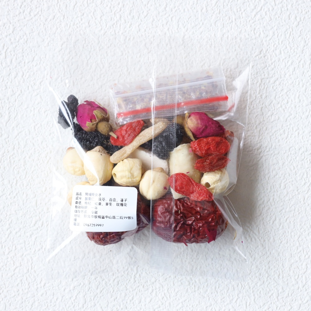成分:正品酸棗仁.茯苓.百合.蓮子.桑葚.枸杞.紅棗.麥冬.玫瑰